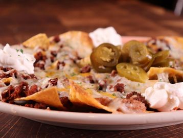 Crispy corn tortilla chips topped with refried bean, melted Mexican cheese and garnished with sour cream and Jalapeno beans.