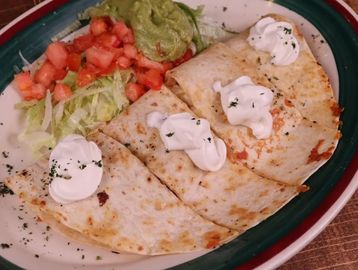 A soft flour tortilla with melted Mexican cheese, garnished with sour cream and guacamole.