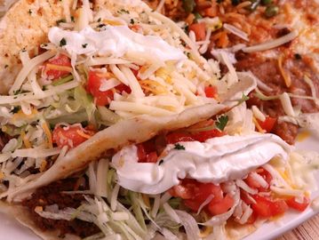 2 Soft or crispy tacos with your choice of ground beef or shredded chicken. Topped with lettuce, tomatoes, cheese, and sour cream. Served with Mexican rice and refried beans.