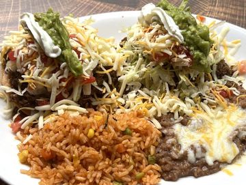 A flour tortilla stuffed with a spread of refried beans and your choice of ground beef, shredded chicken or vegetables. Topped with melted cheese and sour cream. Served with Mexican rice & refried beans.